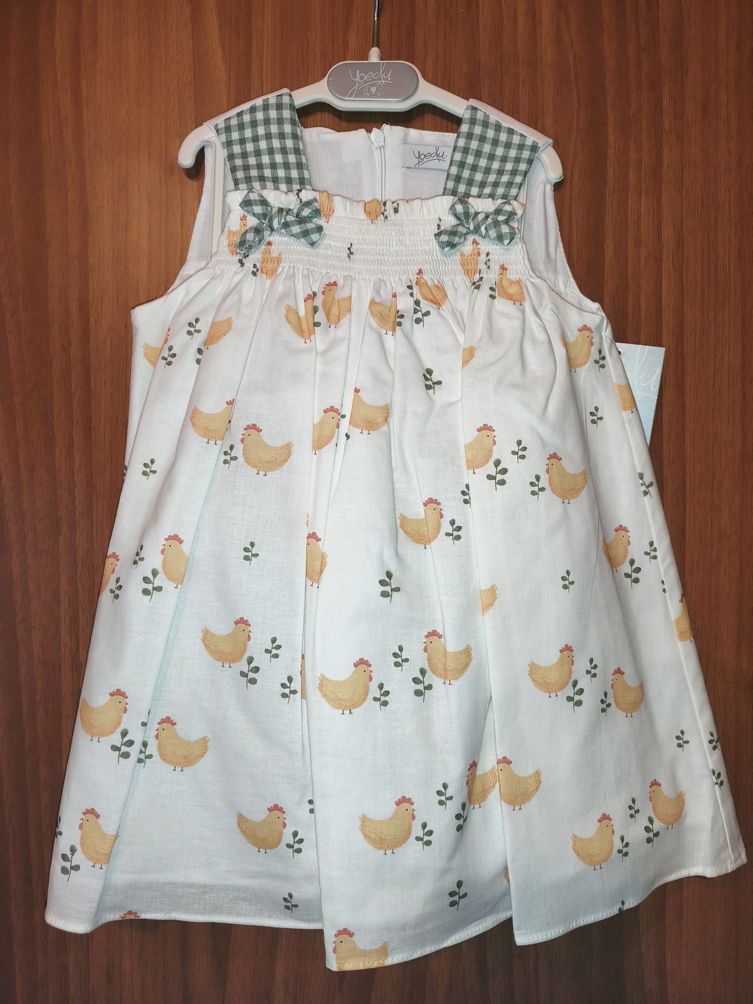 Jesusito con estampado de gallinas, y bragas de vichy verde.