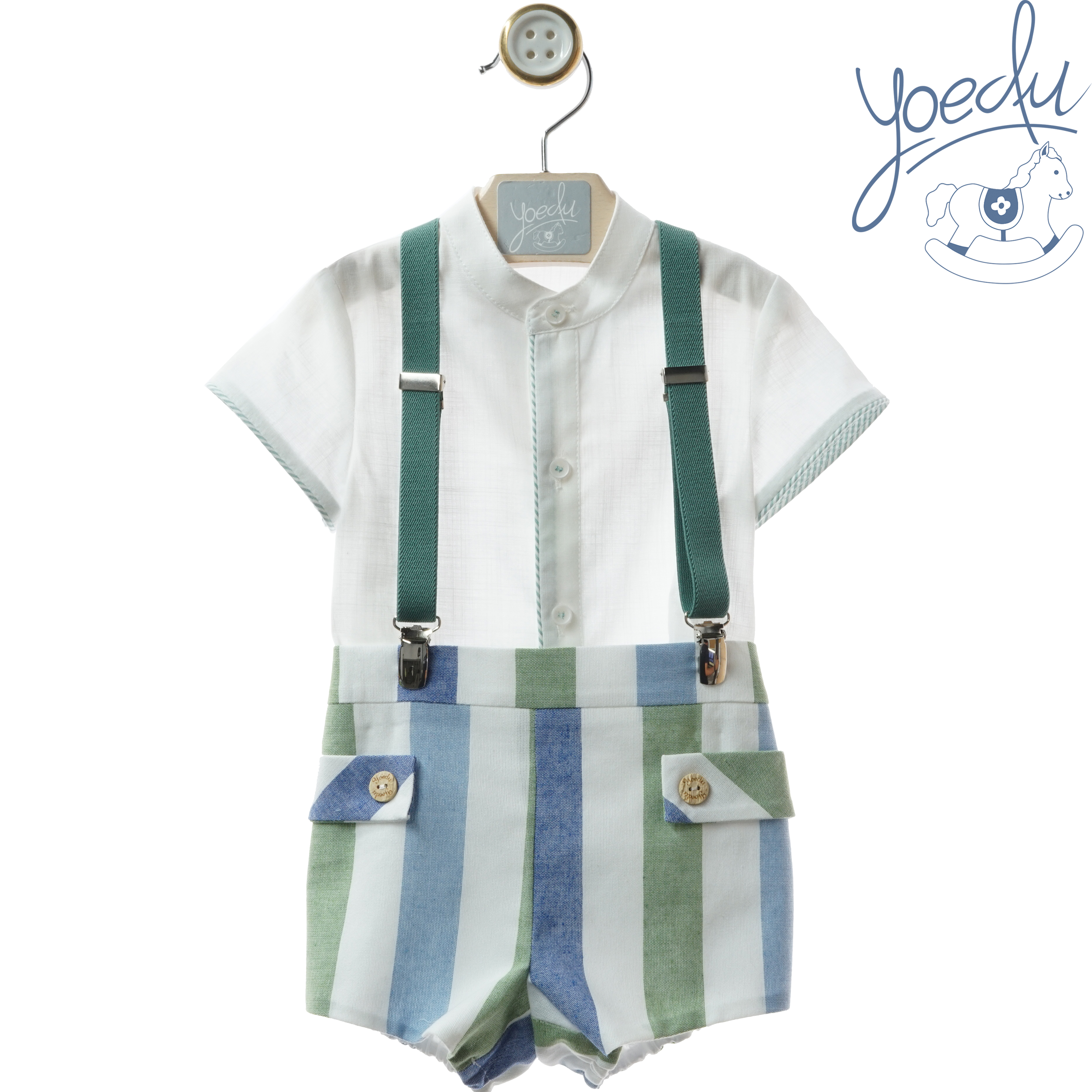 Conjunto camisa blanca con cenefa en el medio y en las mangas verdes. Pantalón de rayas con botones y tirantes verdes.
