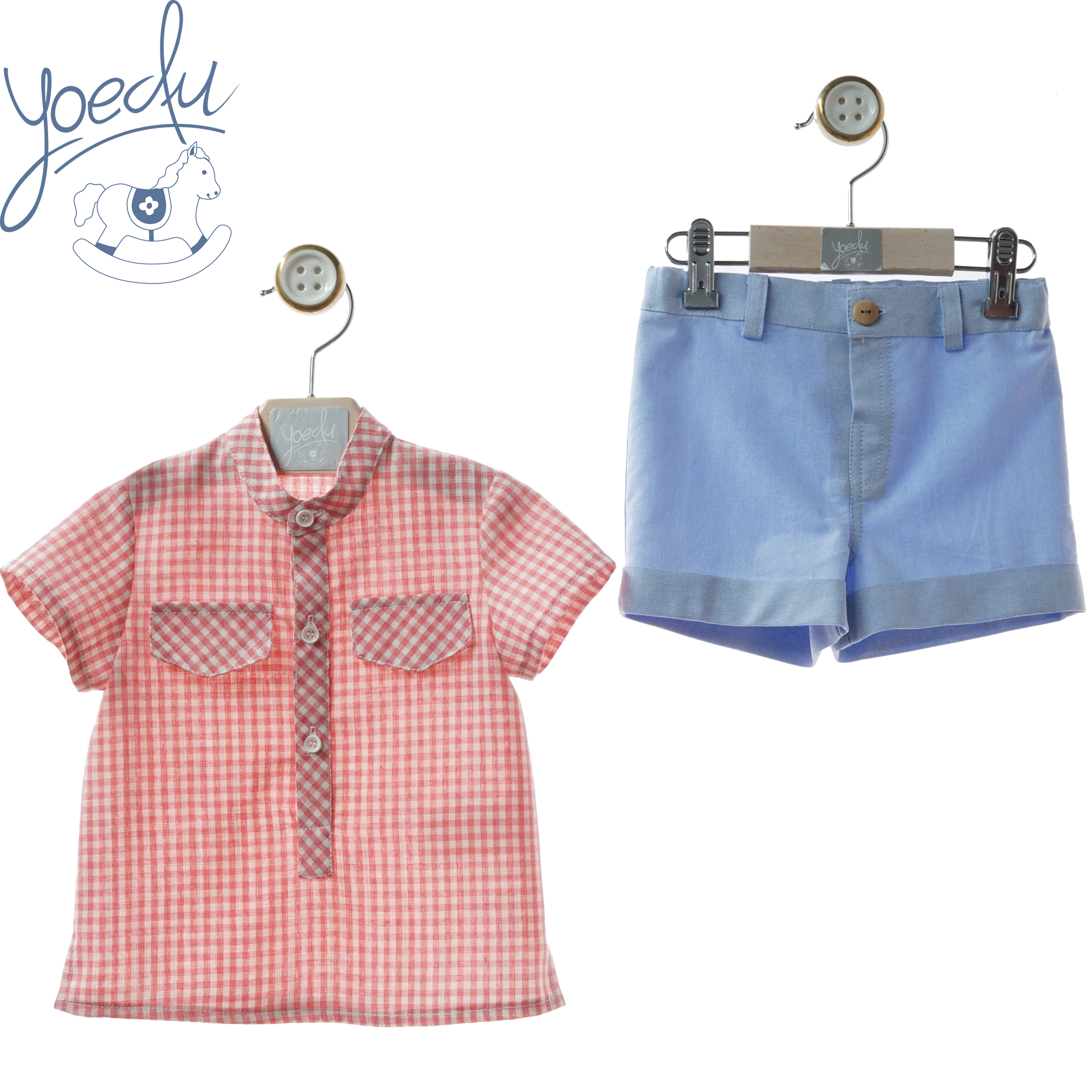 Conjunto bermuda azul y camisa vichy roja.