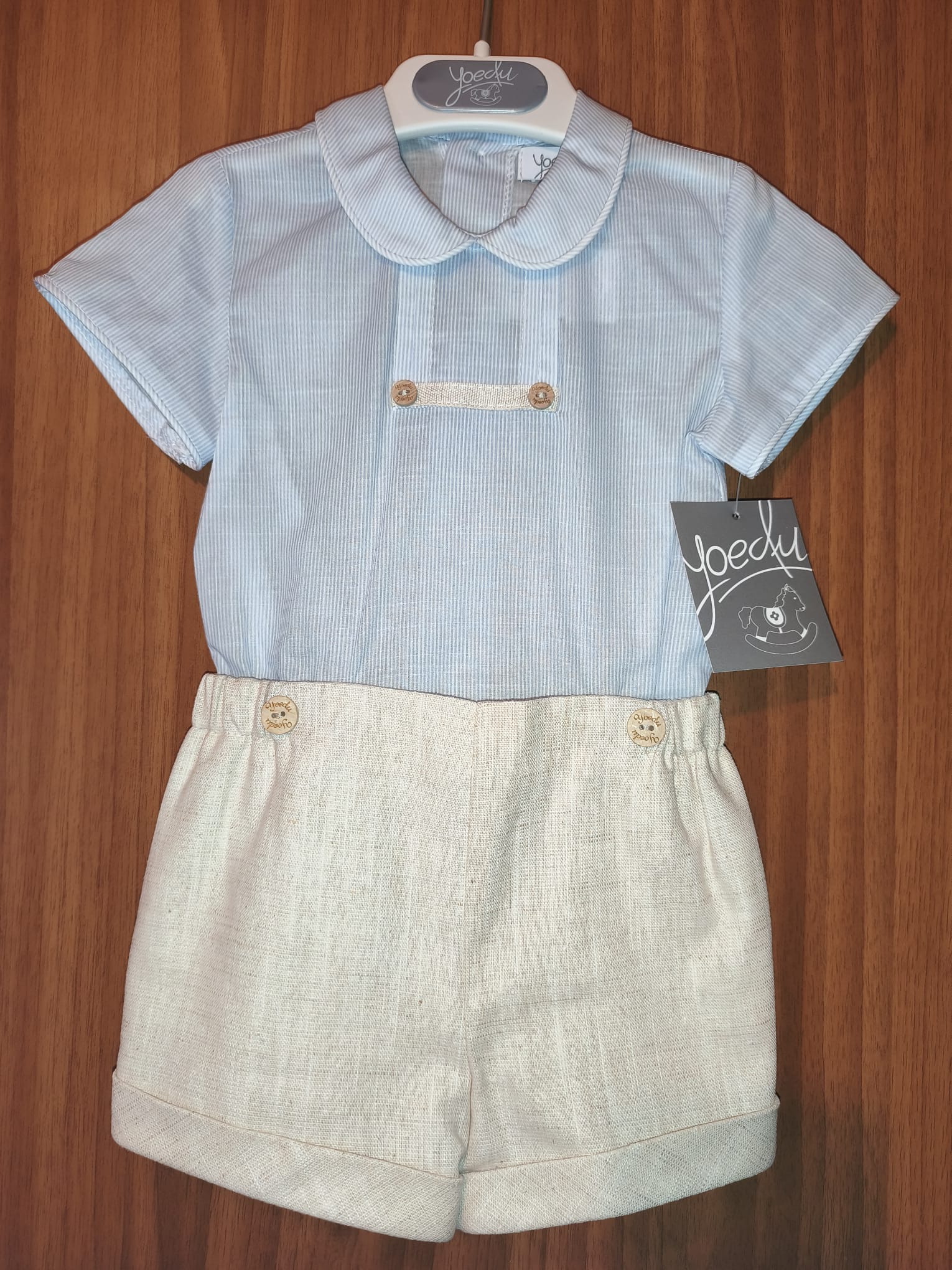 Conjunto bebé camisa rayas y bermuda.