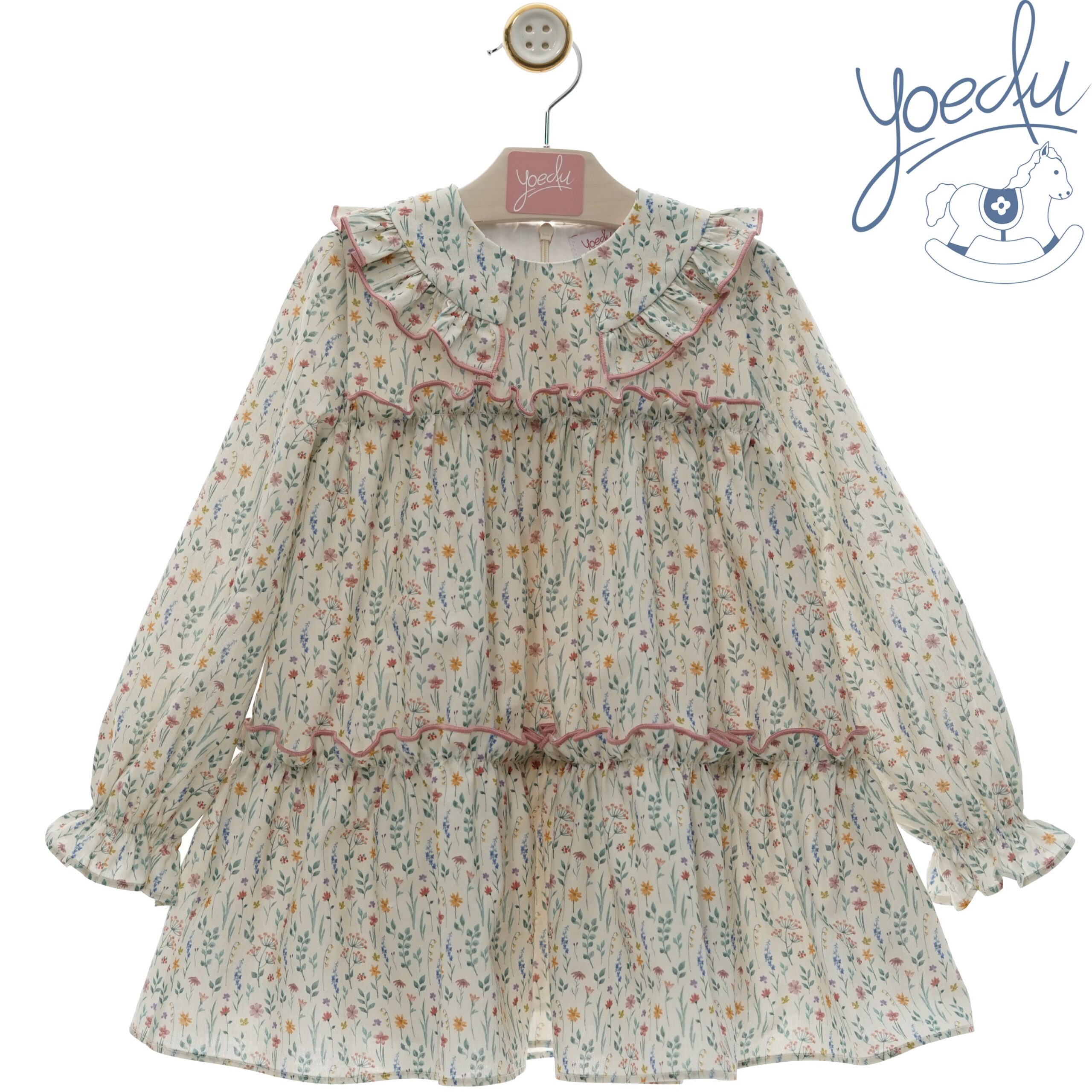 Vestido a flores, con panal de abejas en la altura del pecho.