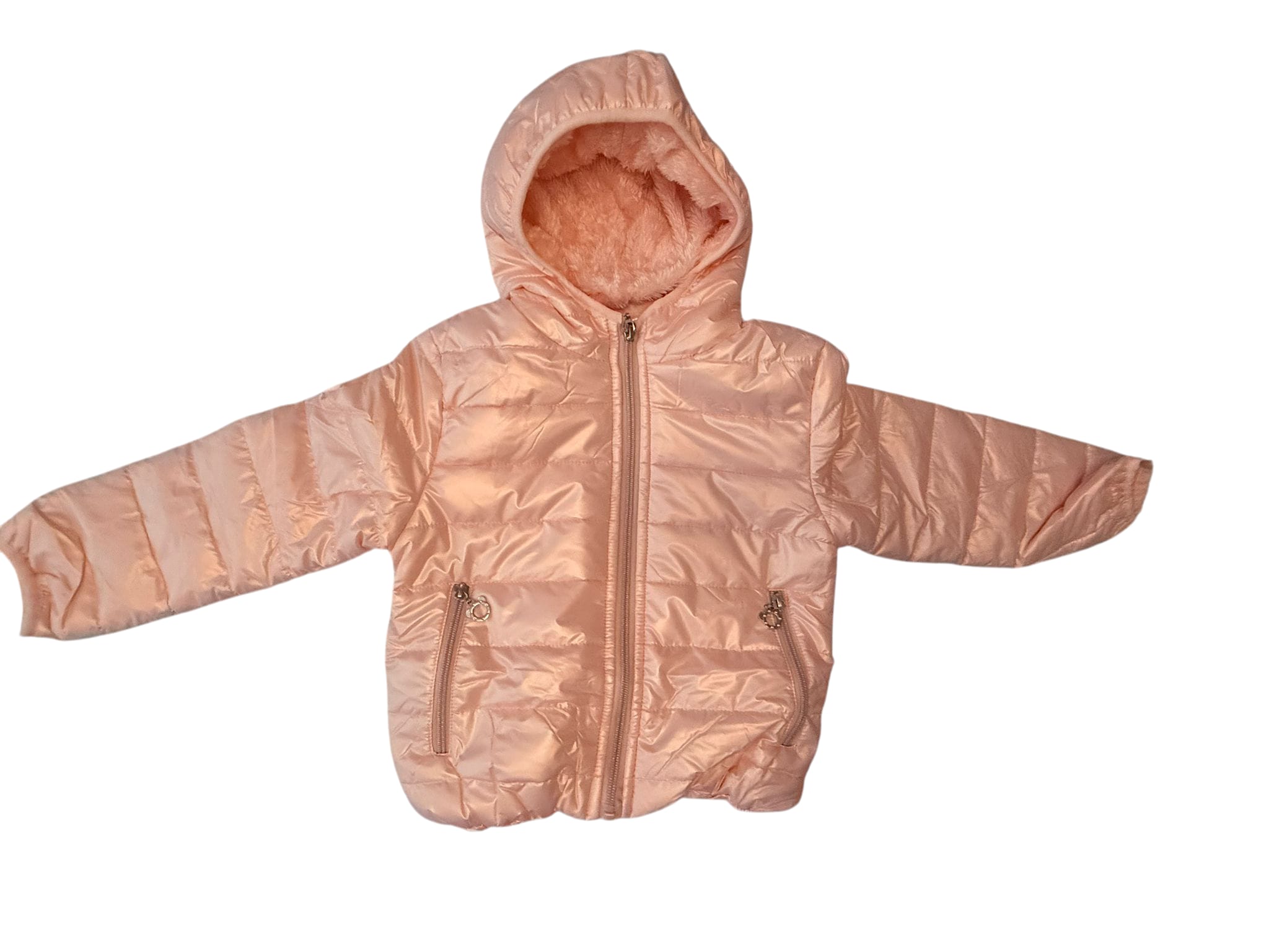 Cazadora tipo plumas, por dentro con pelo en cuerpo y capucha. Rosa maquillaje y rosa fucsia.