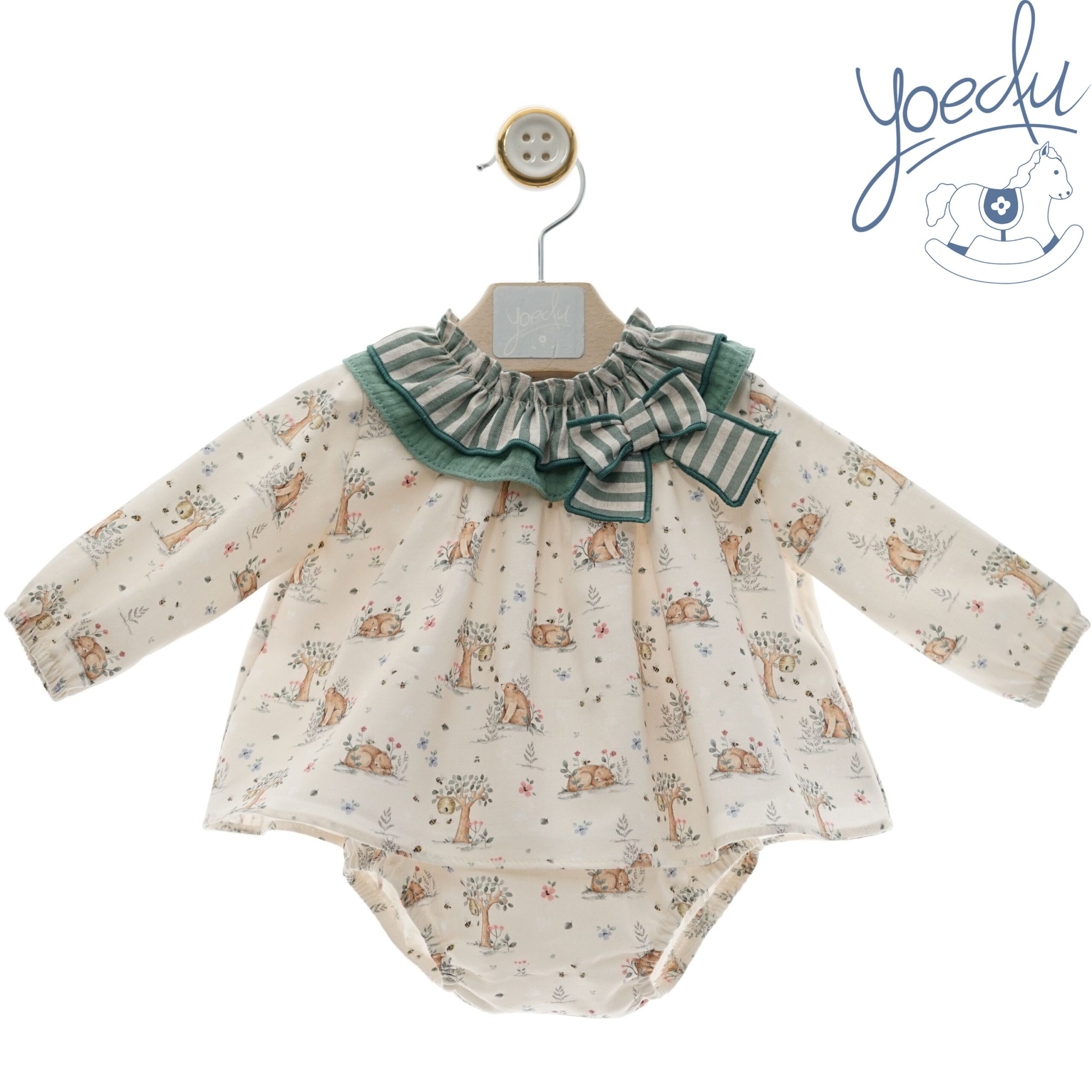 Vestido bambulina, con motivos de osos y cuello en tonos verdes.