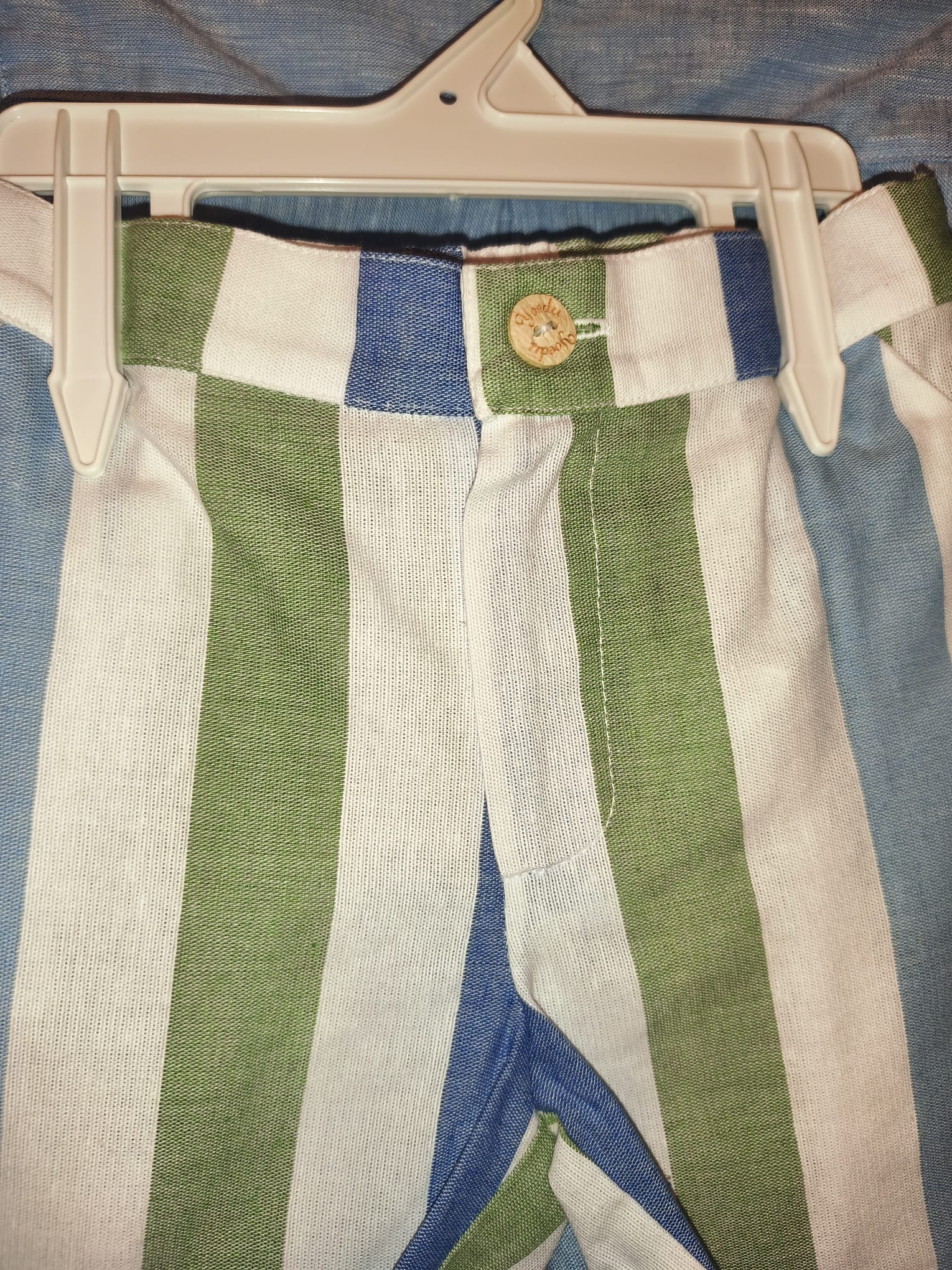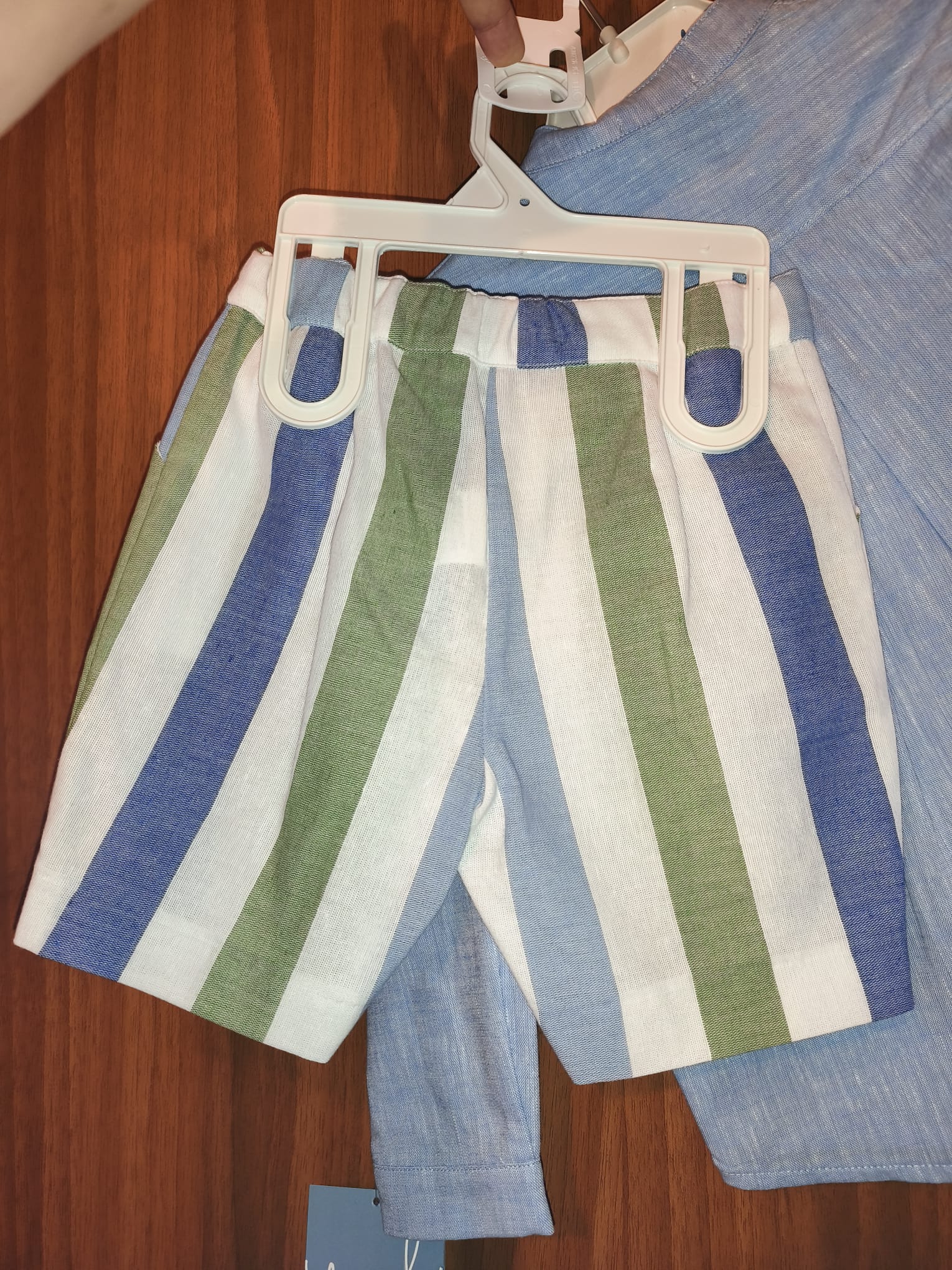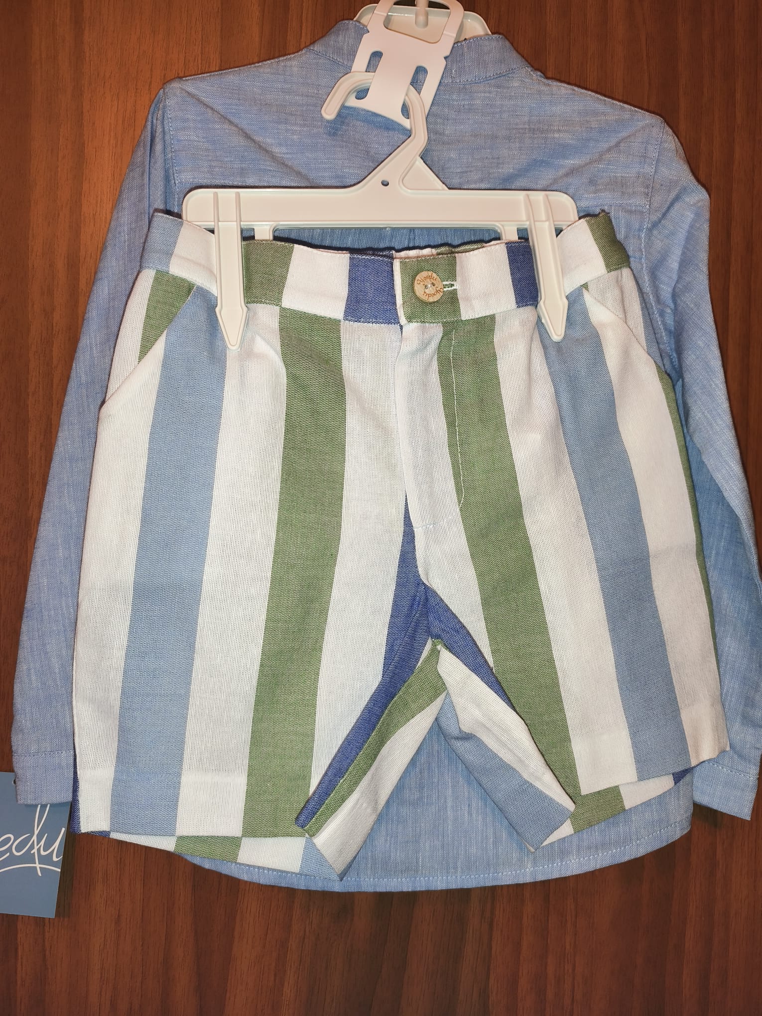Traje niño, camisa lisa azul y pantalón de rayas.