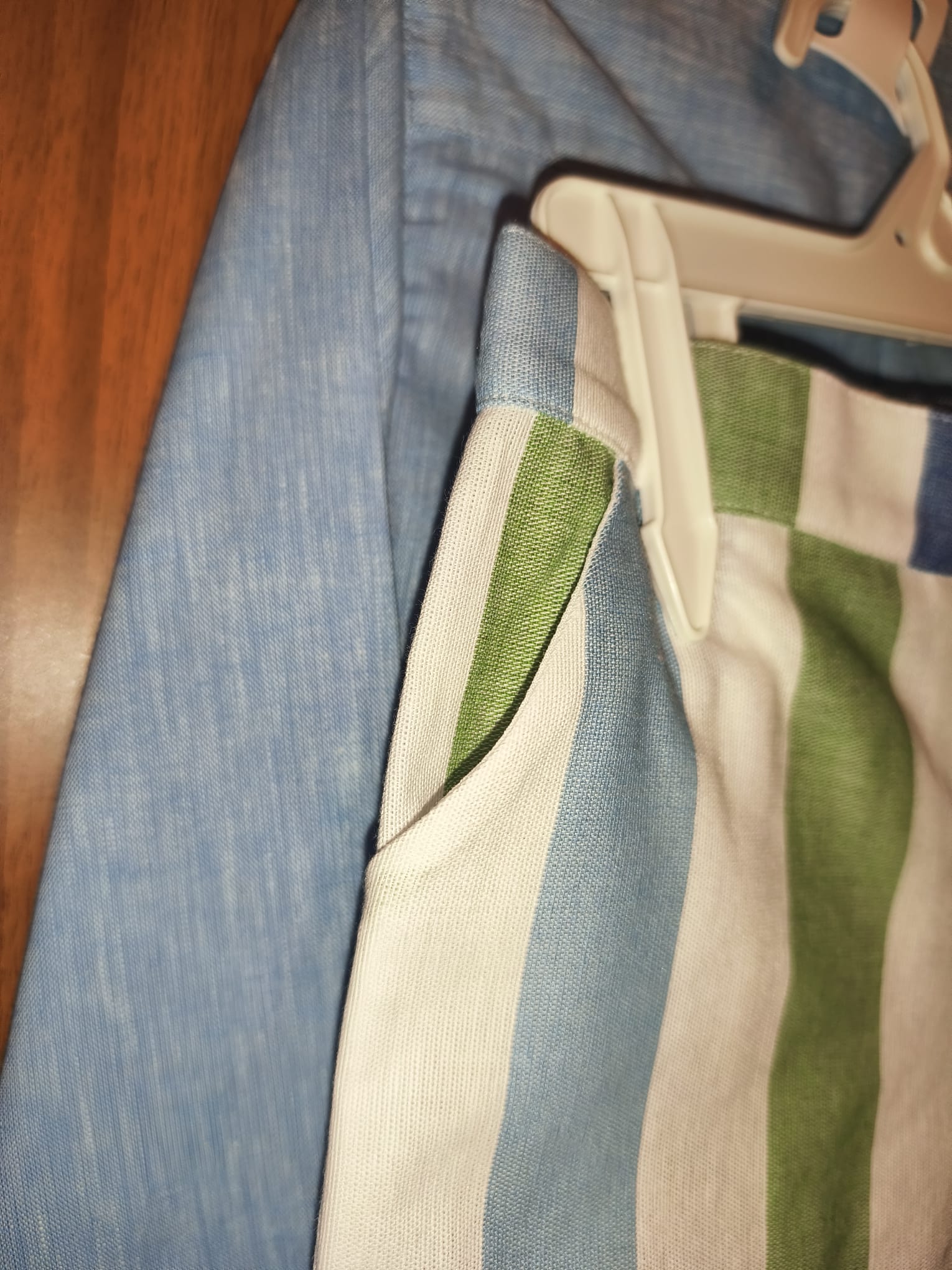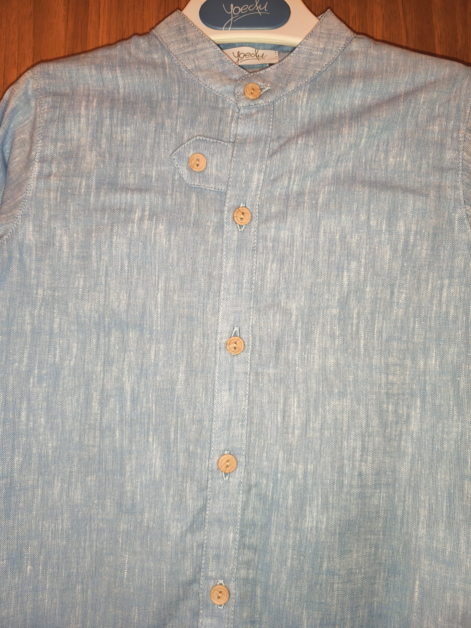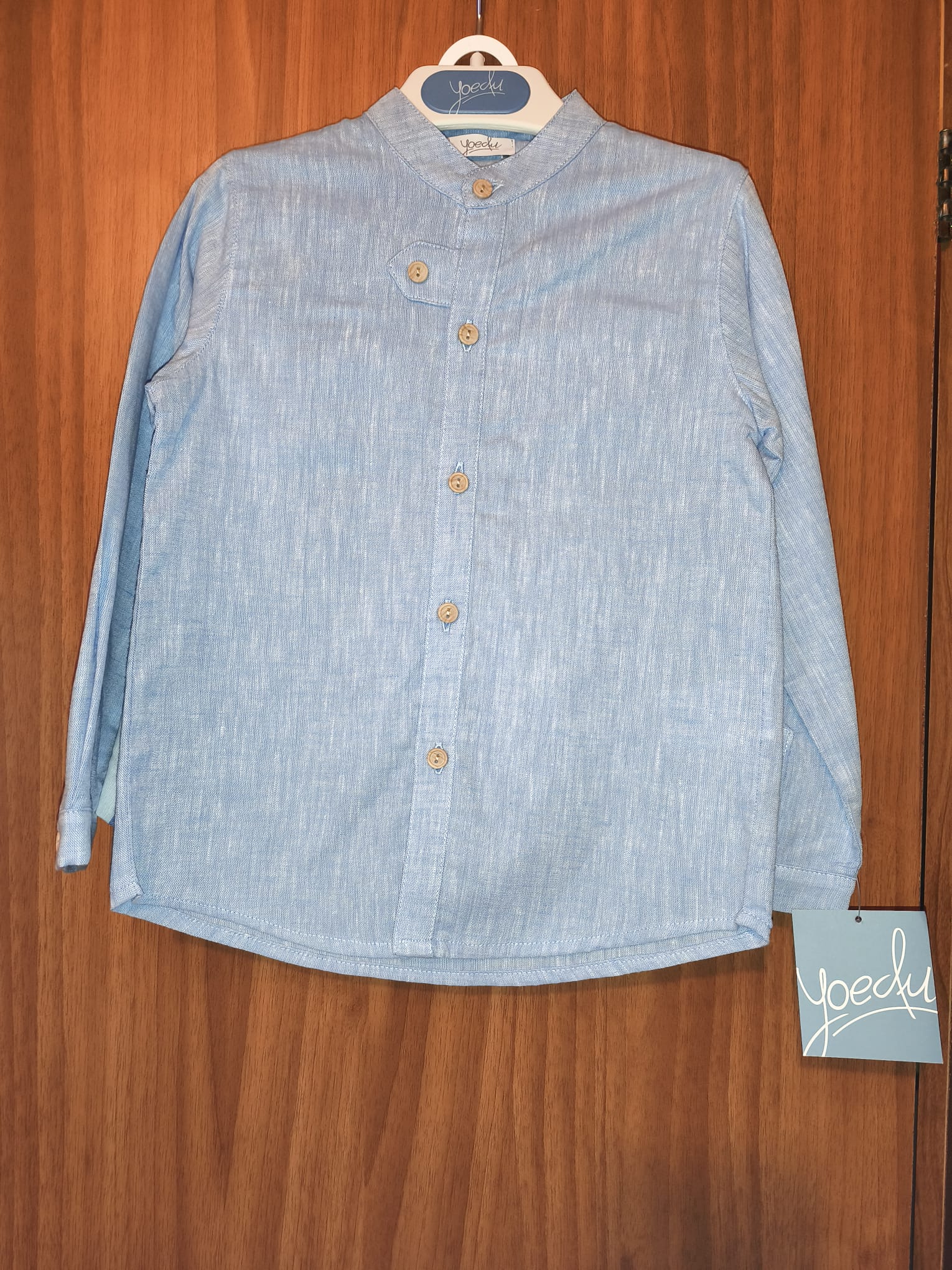 Traje niño, camisa lisa azul y pantalón de rayas.