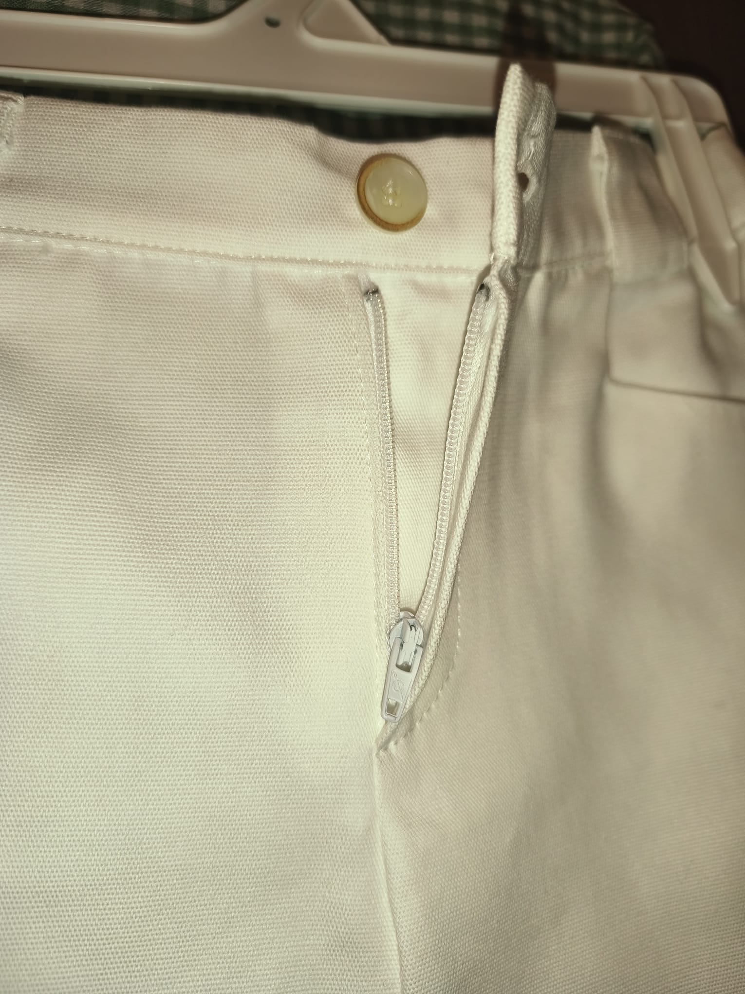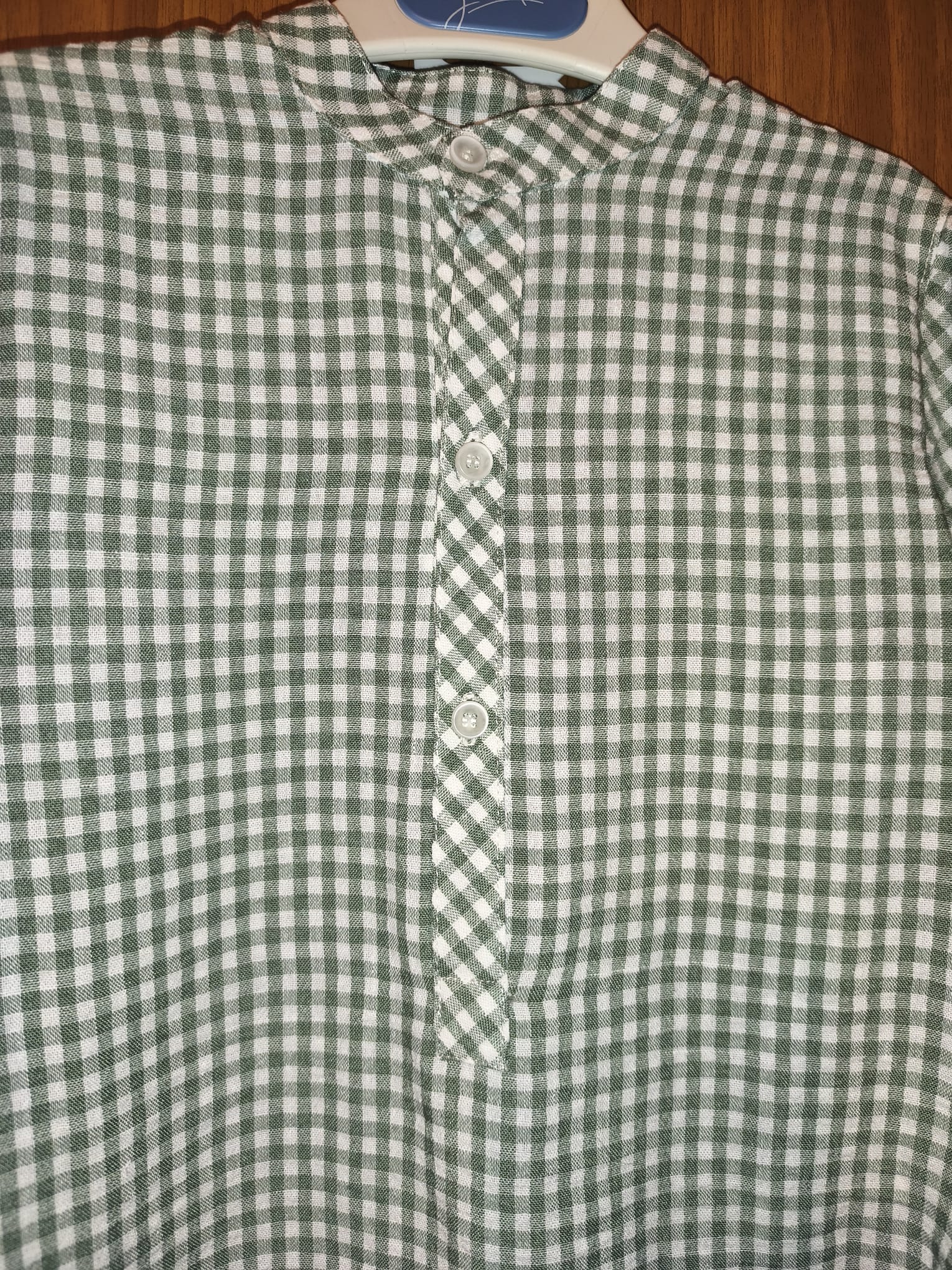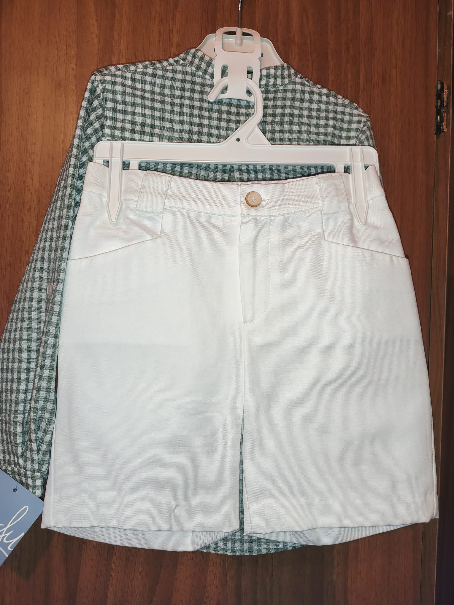 Conjunto camisa vichy verde y bermuda blanca.
